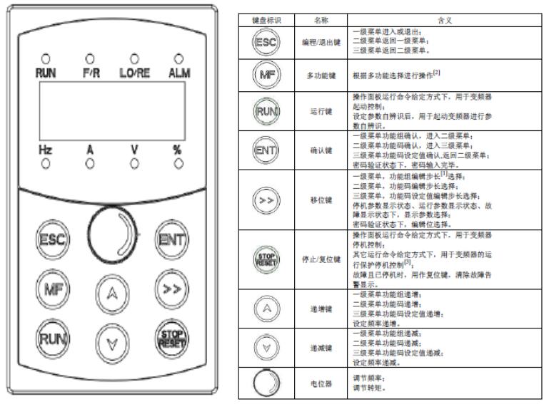 控制面板有啟動/停止旋鈕,速度調(diào)節(jié)旋鈕,變頻器顯示和設(shè)置小面板,還包括運行、蜂鳴、告警指示燈,*作簡單。